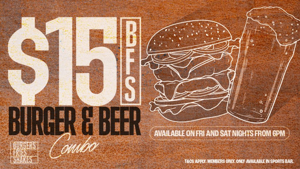 Offer includes BFS Bird of BFS Beef Burger + standard draught beer only: Tooheys NEW, Tooheys OLD, Tooheys Ultra, XXXX Gold, Hahn Super Dry, Hahn 3.5, Hahn Lite, VB, Carlton Draught